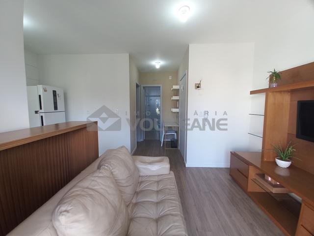 1 dormitório, 1 closet, 1 banheiro social, cozinha, área de serviço, sala de estar, 1 sacada, churrasqueira, mobília (TOTALMENTE MOBILIADO.), fundos.
