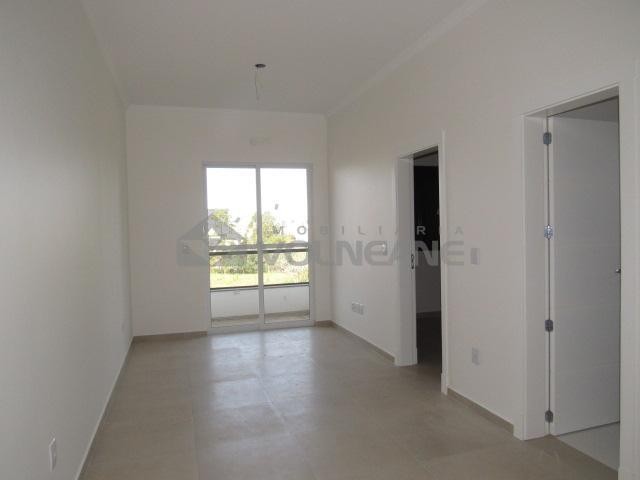 1 dormitório, 1 banheiro social, cozinha, área de serviço, sala de estar, 1 sacada, 1 vaga de garagem, churrasqueira, elevador, frente.
