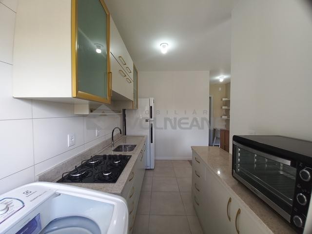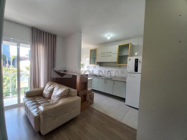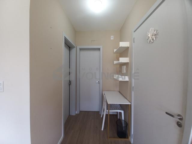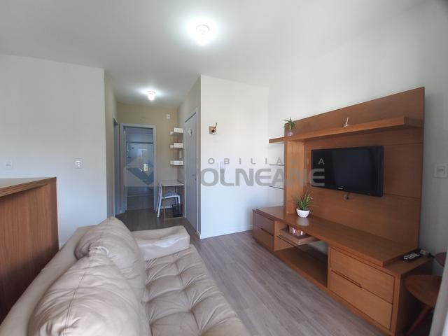 1 dormitório, 1 closet, 1 banheiro social, cozinha, área de serviço, sala de estar, 1 sacada, churrasqueira, mobília (TOTALMENTE MOBILIADO.), fundos.
