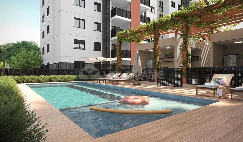 2 dormitórios sendo 1 suíte, 1 banheiro social, cozinha, área de serviço, sala de estar, 1 sacada, 1 vaga de garagem, churrasqueira, antena coletiva, elevador, gás central, jardim, estacionamento, playground, portaria, salão de festas, frente, churrasqueira no prédio, piscina no prédio.